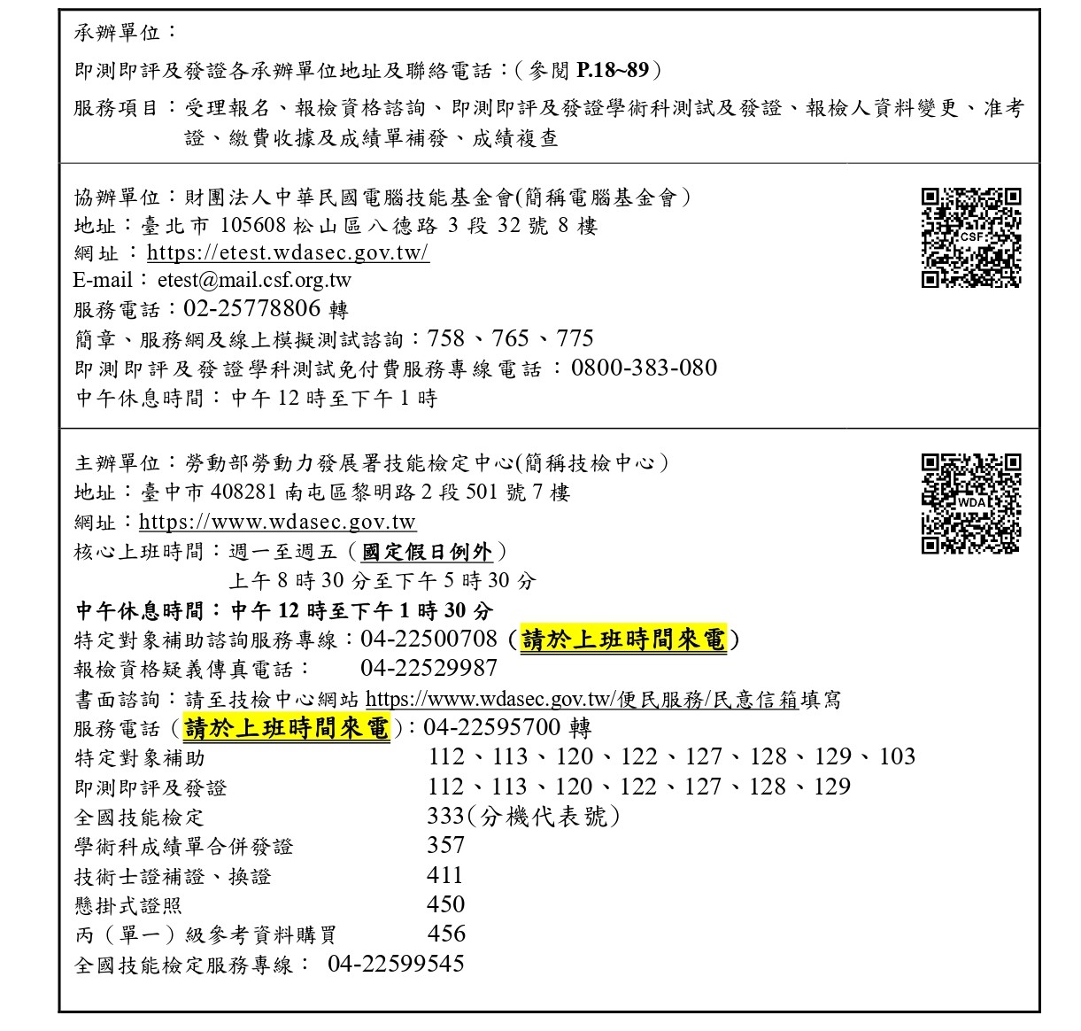 服務項目:受理報名、報檢資格諮詢、即測即評及發證學術科測試及發證、報檢人資料變更、准考證、繳費收據及成績單補發、 成績複查